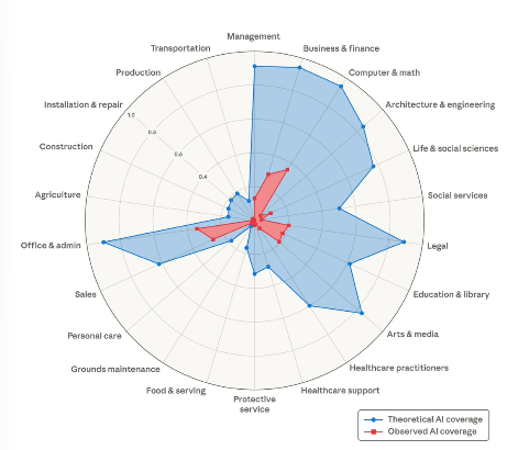 The Anthropic approach combines theoretical task-level exposure estimates with actual usage data drawn from millions of real Claude conversations, weighting automated and work-related uses more heavily than casual or augmentative ones. The result is a map of where AI is genuinely being used in professional work, not just where it could hypothetically be used.